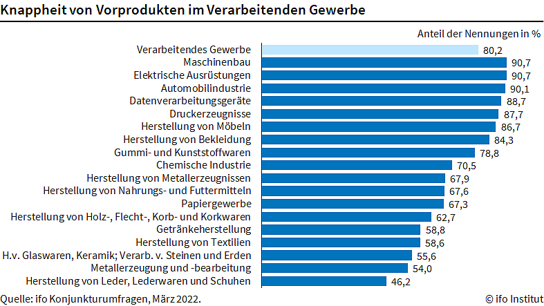 In den Schlüsselbranchen der deutschen Industrie sind die Anteile auf sehr hohem Niveau nahezu unverändert geblieben. So berichteten rund 90 Prozent der Unternehmen aus der Automobilindustrie, dem Maschinenbau und der Elektroindustrie von Lieferproblemen. In der Chemischen Industrie stieg der Anteil von 58,4 auf 70,5 Prozent. Auch bei den Herstellern von Bekleidung berichteten deutlich mehr Unternehmen von Knappheiten. Ursprünglich hatten die Unternehmen für den Sommer mit einer Entspannung gerechnet. Die wird sich nun weiter verzögern, ergänzt Wohlrabe.