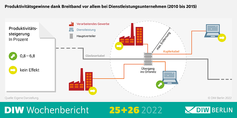 Das zeigt eine aktuelle Studie der Abteilung Unternehmen und Märkte im Deutschen Institut für Wirtschaftsforschung (DIW Berlin). Einige Dienstleistungsunternehmen, beispielsweise in der Luft- und Schifffahrt, im Bereich Film und TV, in der Datenverarbeitung und Werbung, konnten schnellere Internetverbindungen zu ihrem Vorteil nutzen – sie arbeiteten fortan dank des Breitbandausbaus um rund ein bis zu knapp sieben Prozent produktiver als zuvor. Industrieunternehmen des verarbeitenden Gewerbes, also beispielsweise Chemie- und Pharmakonzerne sowie Maschinen- und Fahrzeugbauer, hatten jedoch nichts vom schnelleren Internet.