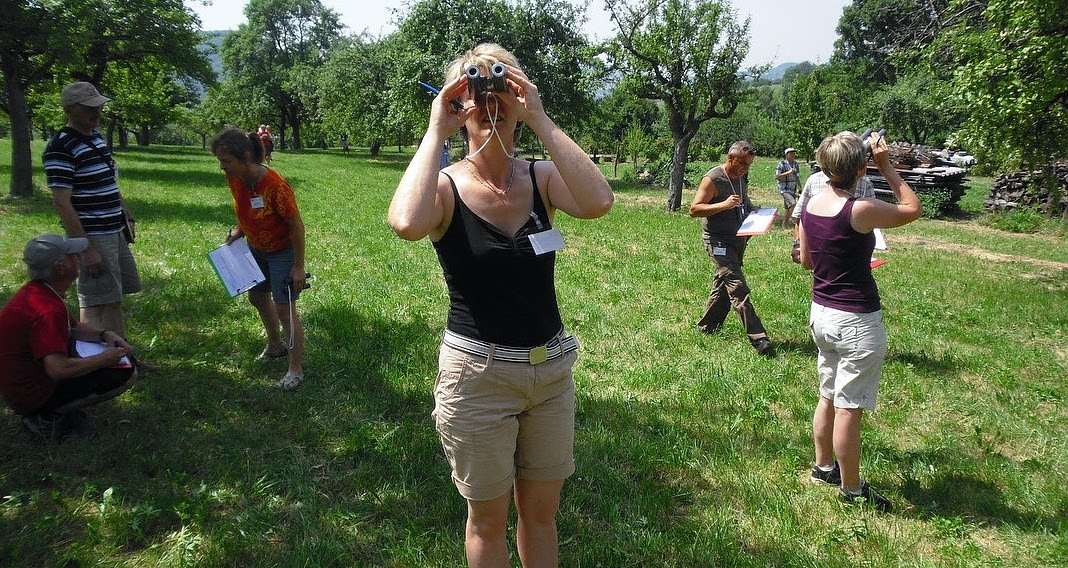 Ernteschätzung mit Augenmaß - Seit 1995 erstellt der VdF über die sogenannte Bavendorfsche Fruchtbehangschätzung Prognosen über die Ernte der Streuobstäpfel. Mit einem Spezialfernrohr, dem sogenannten Gucki, werden fünf Ausschnitte ins Visier genommen und der Apfelbehang gezählt. (Foto: VdF)