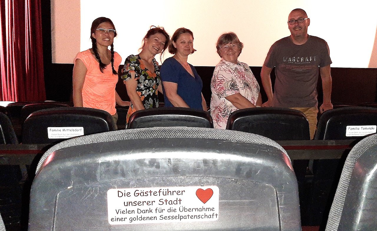 Da die Teilnahme an den Führungen kostenlos ist, wird stets um eine Spende gebeten. Diese Spenden werden von den Gästeführern direkt weitergegeben – so auch hier. Mit der Übernahme einer goldenen Sesselpatenschaft wollen die Gästeführer das Kino auch langfristig unterstützen und so sicher stellen, dass diese tolle Einrichtung in unserer Stadt erhalten bleibt.