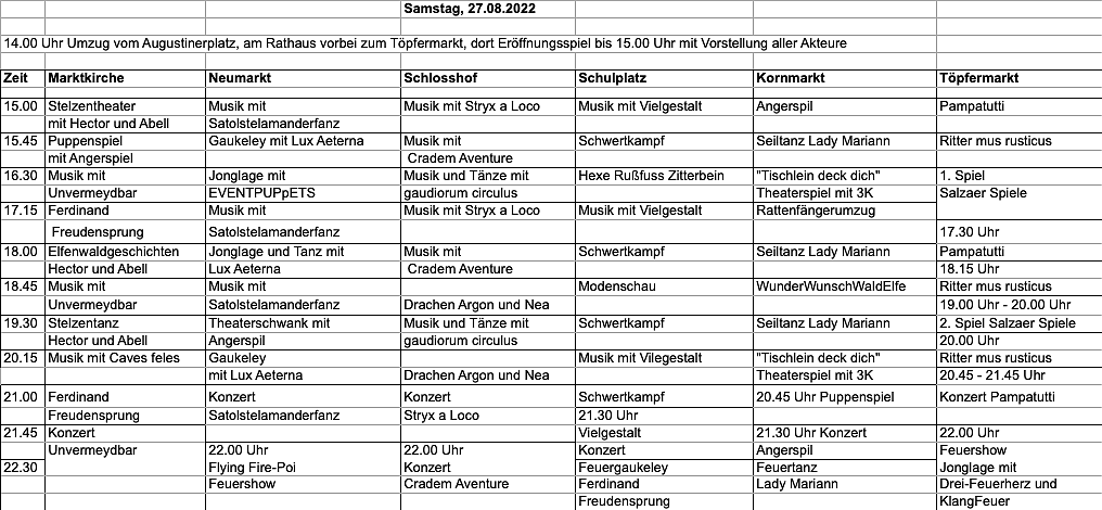 Das Fest beginnt am Samstage, um die zweite Stund nach Mittag mit dem Umzug aller Gaukler, Musikanten, Stelzenläufer, Ritter und Seiltänzer durch die Straßen bis zum Rathaus und von dort zum Töpfermarkt. Hier wird der Bürgermeister der Stadt höchstpersönlich gemeinsam mit dem Herold Radolf zu Duringen und dem Gastgeberpaar der Fuhrleute das Fest eröffnen, heißt es vom einheimischen Kulturamt.