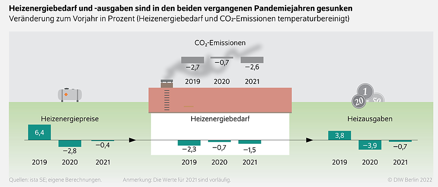 In den Pandemiejahren 2020 und 2021 haben deutsche Haushalte trotz vermehrtem Homeoffice temperaturbereinigt weniger geheizt und haben weniger für Heizenergie ausgegeben...