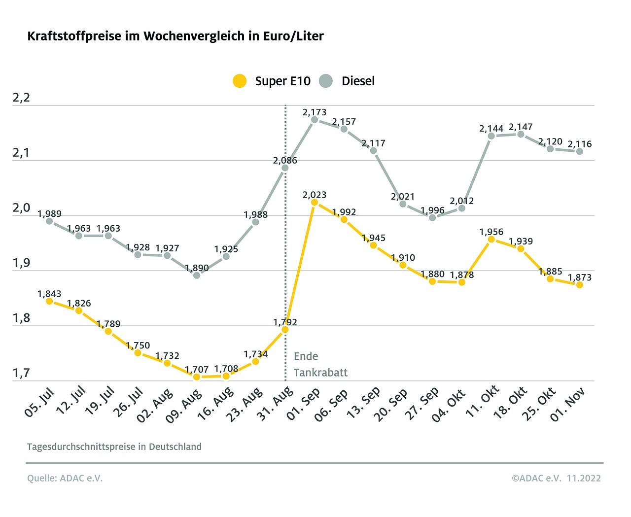 Autor: redAnders beim Diesel: Ein Liter kostete im Monatsmittel 2,105 Euro – ein Plus von 2,7 Cent gegenüber dem Vormonat. Damit war der Dieselpreis im Oktober nur 3,5 Cent niedriger als im März 2022, dem bislang teuersten Tank-Monat aller Zeiten. Benzin hingegen kostete im Oktober 16 Cent weniger als im März.