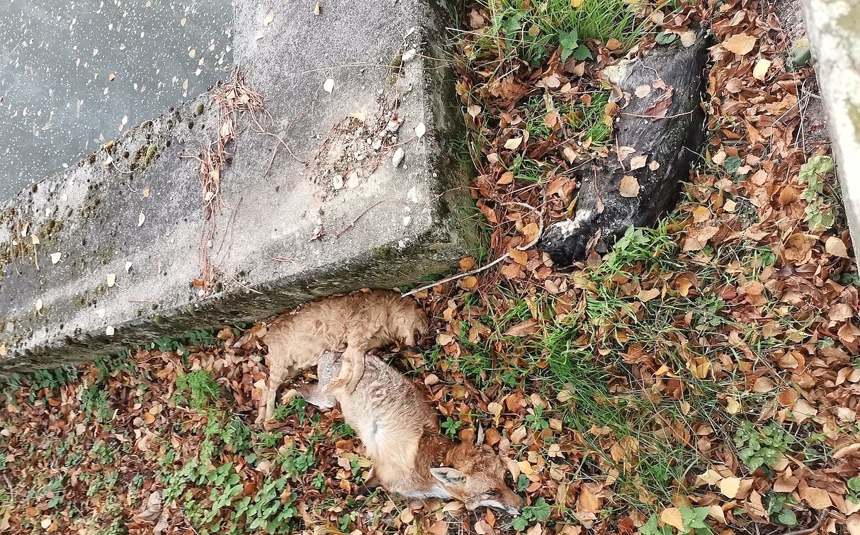 Hinter einem Zaun, der den Spielplatz von einem Bach trennt, lagen drei tote Tiere. Zwei Katzen und ein Fuchs waren augenscheinlich dort abgelegt worden.
