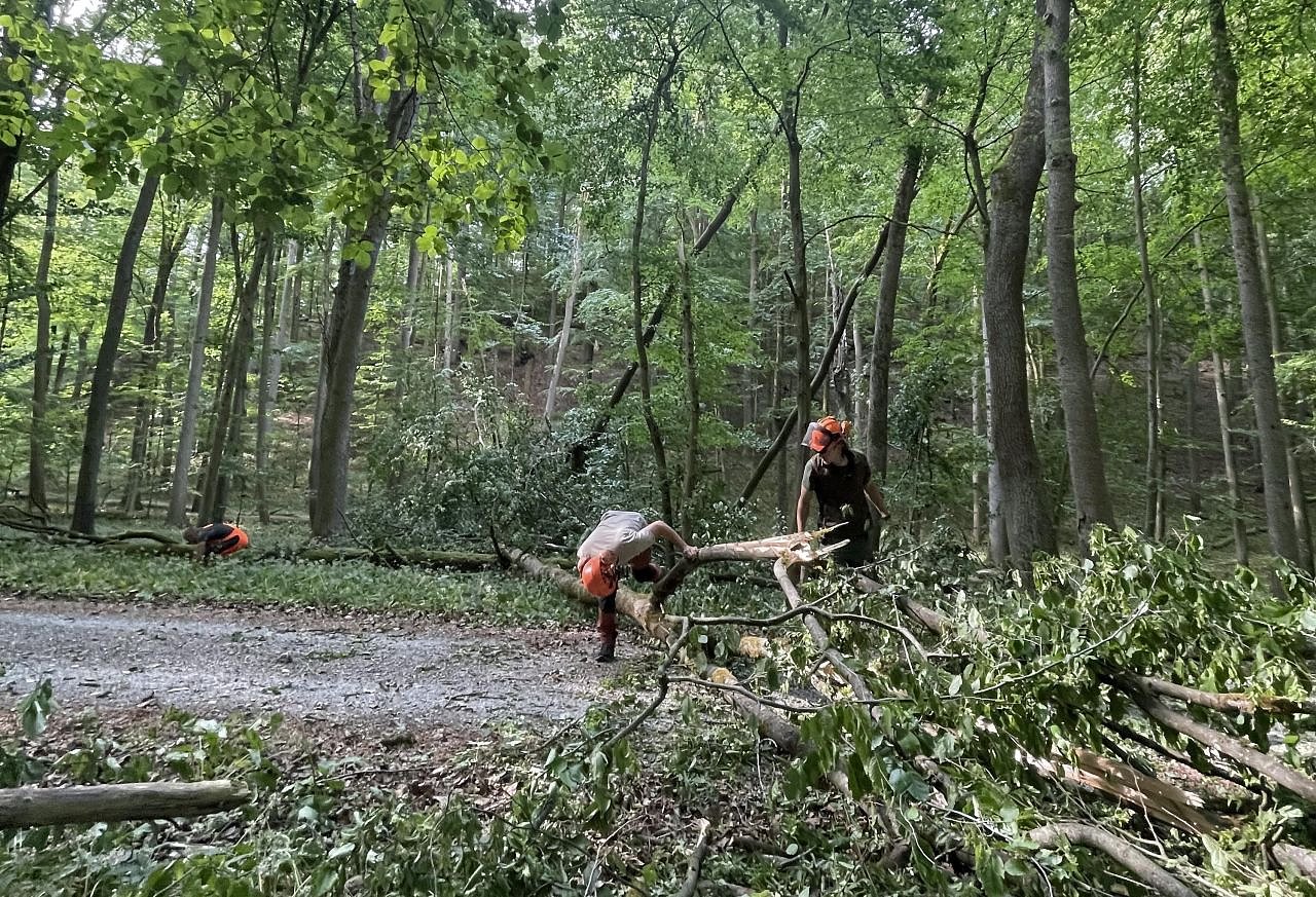 Das kann sowohl bedeuten, dass der gesamte Baum zu Boden gebracht werden muss, als auch, dass nur ein einzelner Totholzast oder ein lose in der Krone hängender Ast entfernt werden müssen. Dabei wird der Einsatz der Motorsäge soweit wie möglich vermieden. Wenn es der Baum, der Aufwand und die Unfallgefährdung zulassen, wird der betreffende Baum mit einer Winde zu Boden gebracht oder - wenn nötig - vom Weg gezogen. Der Grund: Auch nach diesen künstlichen Eingriffen soll das Waldbild so natürlich wie möglich aussehen.