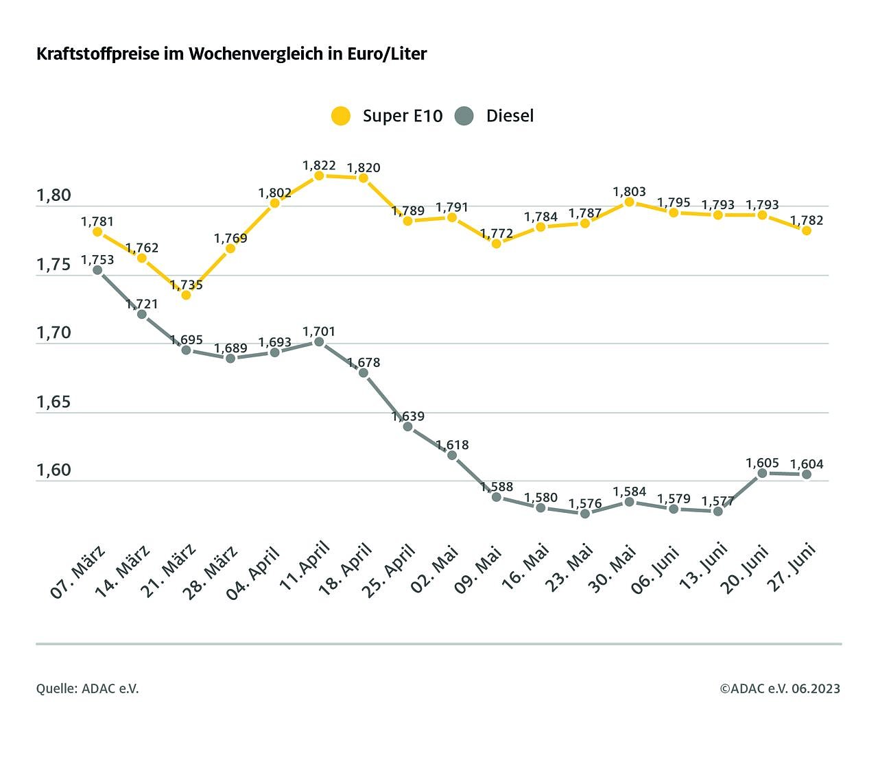 Autor: redLaut aktueller ADAC Auswertung der Kraftstoffpreise in Deutschland kostet ein Liter Super E10 im bundesweiten Mittel derzeit 1,782 Euro, ein Liter Diesel 1,604 Euro. Damit ist die Preisdifferenz zwischen beiden Kraftstoffsorten auf 17,8 Cent je Liter gesunken. Diesel wird um gut 20 Cent je Liter niedriger besteuert als Otto-Kraftstoff.