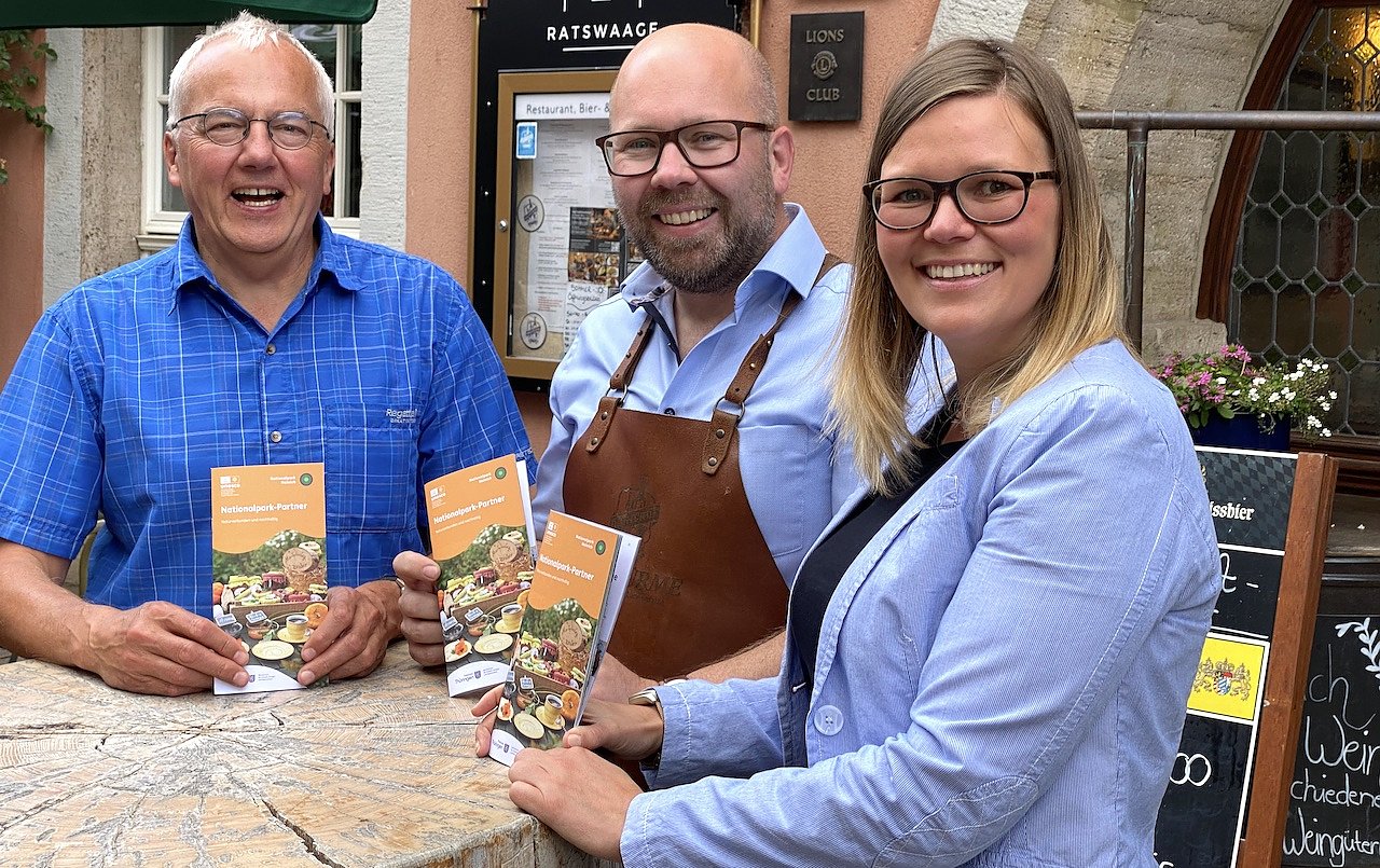 Nationalparkleiter Manfred Großmann und die Geschäftsstellenleiterin des regionalen Dachverbandes Welterberegion Wartburg Hainich, Anne-Katrin Ibarra Wong, hielten am gestrigen Nachmittag stolz die druckfrische Broschüre Nationalpark-Partner: Naturverbunden und nachhaltig in ihren Händen, in der sich die aktuell 17 Nationalpark-Partner vorstellen. Treffpunkt war auf halbem Weg zwischen Nationalpark-Verwaltung und Vereins-Geschäftsstelle im historischen Stadtzentrum von Bad Langensalza beim umtriebigen Gastronom Martin Braun, dem Betreiber der Ratswaage und einem der aufgeführten Nationalpark-Partner.