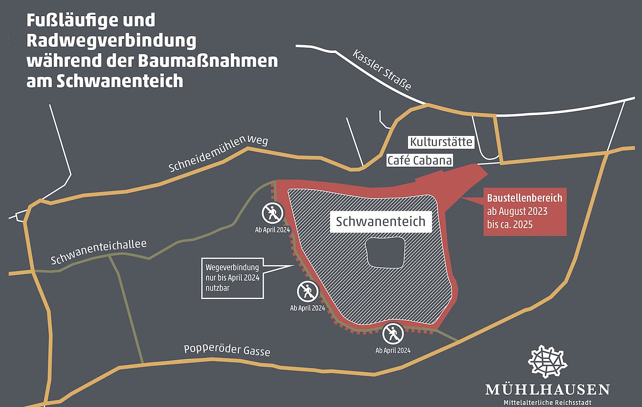 Aufgrund der Bauarbeiten werden der Bereich rund um den Spielplatz und am Nordufer nicht mehr begehbar sein. Der Zugang zum Café Cabana und zur Kulturstätte bleibt jedoch bestehen. Die übrigen Bereiche westlich und südlich des Schwanenteichs sind weiterhin nutzbar und aus Richtung Popperöder Quelle sowie Süden (Popperöder Gasse) zugänglich.