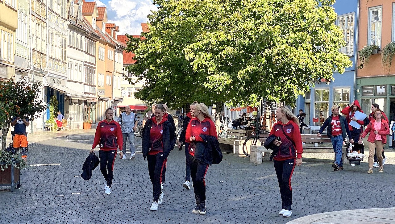 Entspannt laufen die THC-Mädels und ihr Trainer durch die historische Innenstadt zur Saisoneröffnung auf dem Neumarkt (Foto: oas)
