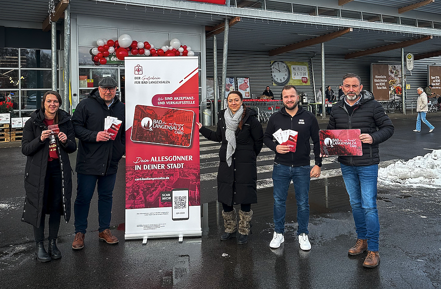 Astrid Lehmann, Leiterin Touristinformation (Akzeptanz- und Verkaufsstelle der BLC), Christian König, stellv. Vorsitzender Gewerbeverein Bad Langensalza e.V., Sandra Czerniak, Citymanagerin Bad Langensalza, Dustin Hofmann, Inhaber REWE Dustin Hofmann und Bürgermeister Matthias Reinz (Foto: Büro Citymanagement Bad Langensalza )