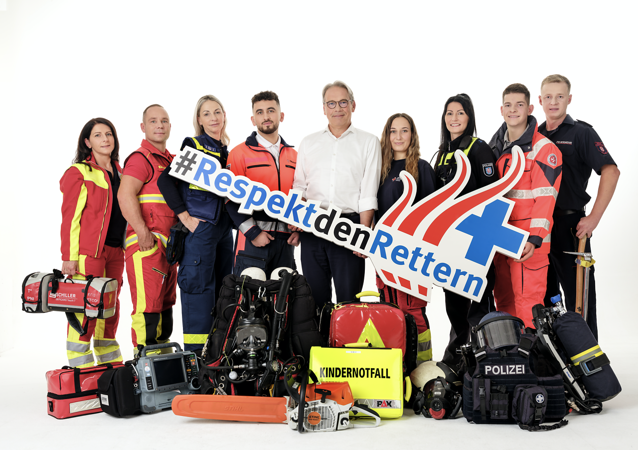 „Es kann nicht sein, dass Frauen und Männer, die anderen Menschen helfen oder sogar deren Leben retten, beschimpft, beleidigt, bei ihrer Arbeit behindert oder attackiert werden. Diese Vorfälle gibt es leider immer wieder. Dabei ist es unsere gesellschaftliche Aufgabe, diese Retterinnen und Retter bei ihrer lebenswichtigen Arbeit zu unterstützen und unsere Pflicht, ihnen für ihren Einsatz Respekt und Dank entgegenzubringen“, sagte Innenminister Georg Maier. „Das Gruppenbild soll zum Nachdenken anregen, ohne mit dem erhobenen Zeigefinger zu agieren.“