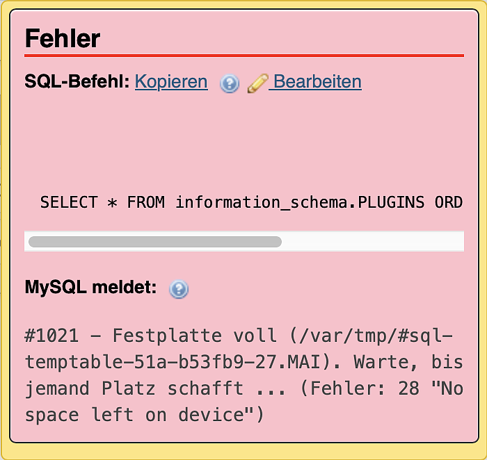 Auf der Server-Administrationsseite stand, dass noch über 270 GByte frei waren. Ich habe drei mal mit Strato (unserem Provider) in Berlin telefoniert und ein Ticket bekommen. Wir haben zwar einen 24/7-Support gebucht, aber das bedeutet nur, dass wir nach 20 Uhr noch Störungen melden können, nicht dass sie die auch beheben oder das es irgendwie priorisiert wird.