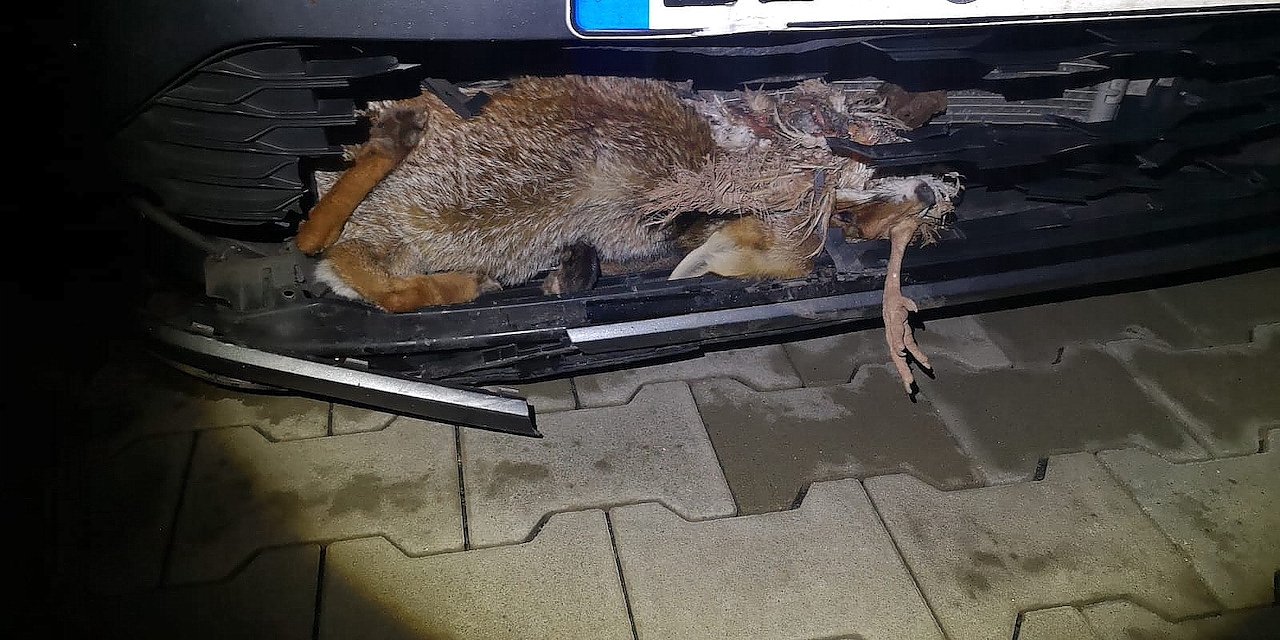 Der Fuchs kollidierte mit einem sich nähernden VW Golf. Die Wucht war so groß, dass das Tier in den Kühlergrill des Fahrzeugs gedrückt wurde und dort verendete.