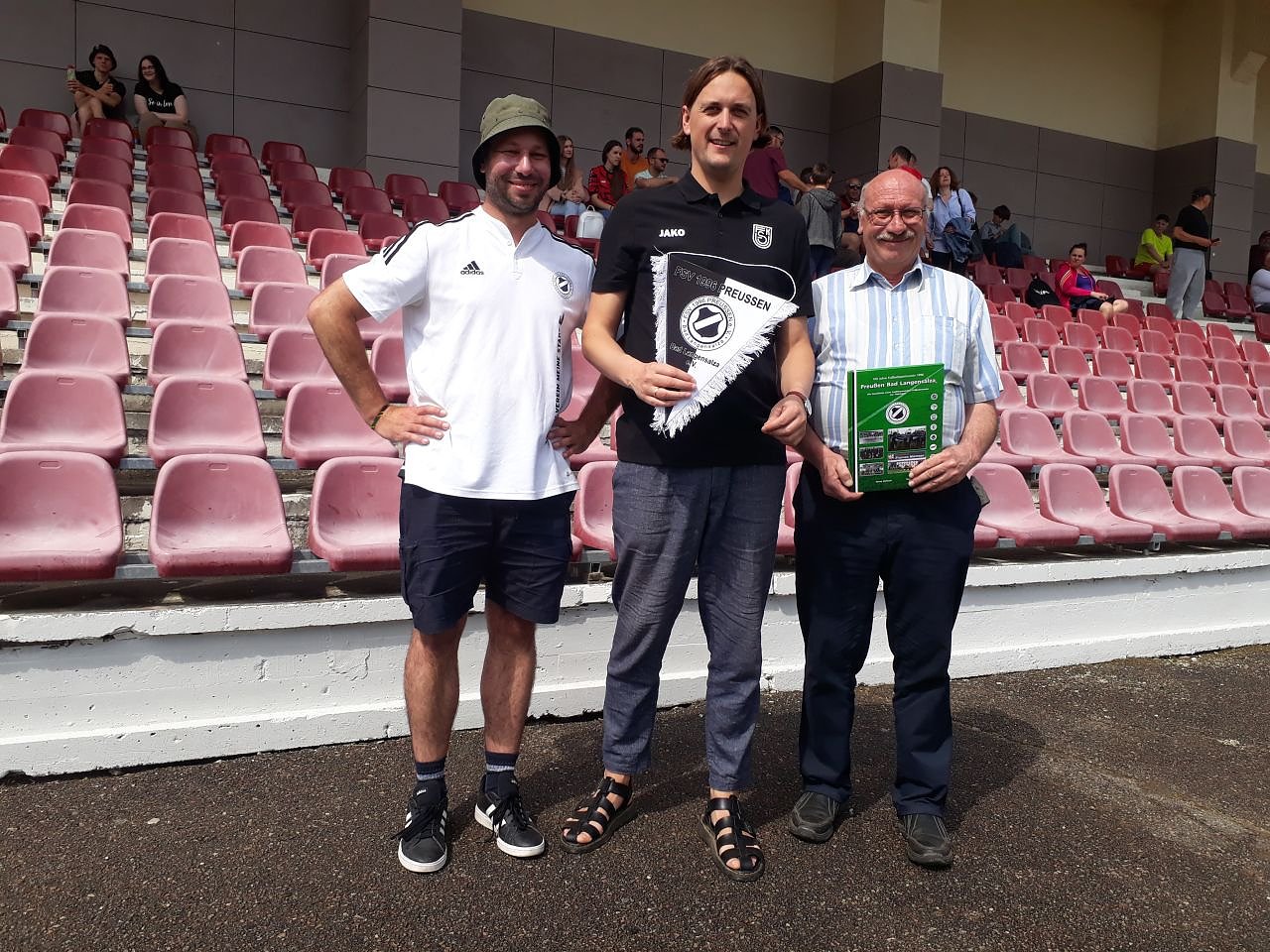 Gesagt, getan. Im Stadion in Ukmerge wussten die Vereinsvertreter des örtlichen Clubs bereits über den Besuch aus Deutschland Bescheid und begrüßten die beiden Gäste mit einem Schal des Vereins. Ronald und Markus Fromm hatten ebenfalls Souvenirs dabei und überreichten den Gastgebern einen Wimpel und eine Vereinschronik des FSV Preußen.