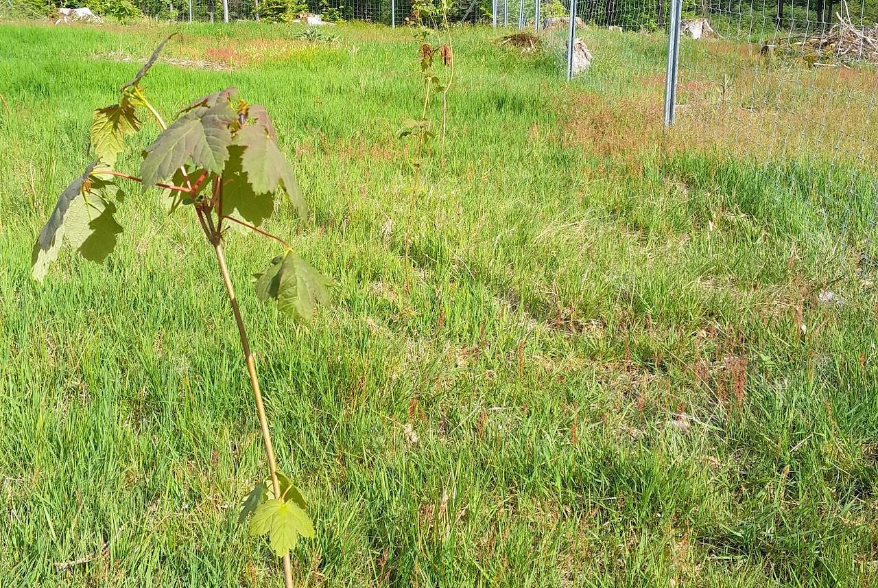 Jungwald im Zaunschutz mit einer Pflanzreihe Bergahorn: Nur regelmäßige Pflege sichert eine gedeihliche Entwicklung zum Klimawald (Foto: Dr. Horst Sproßmann)
