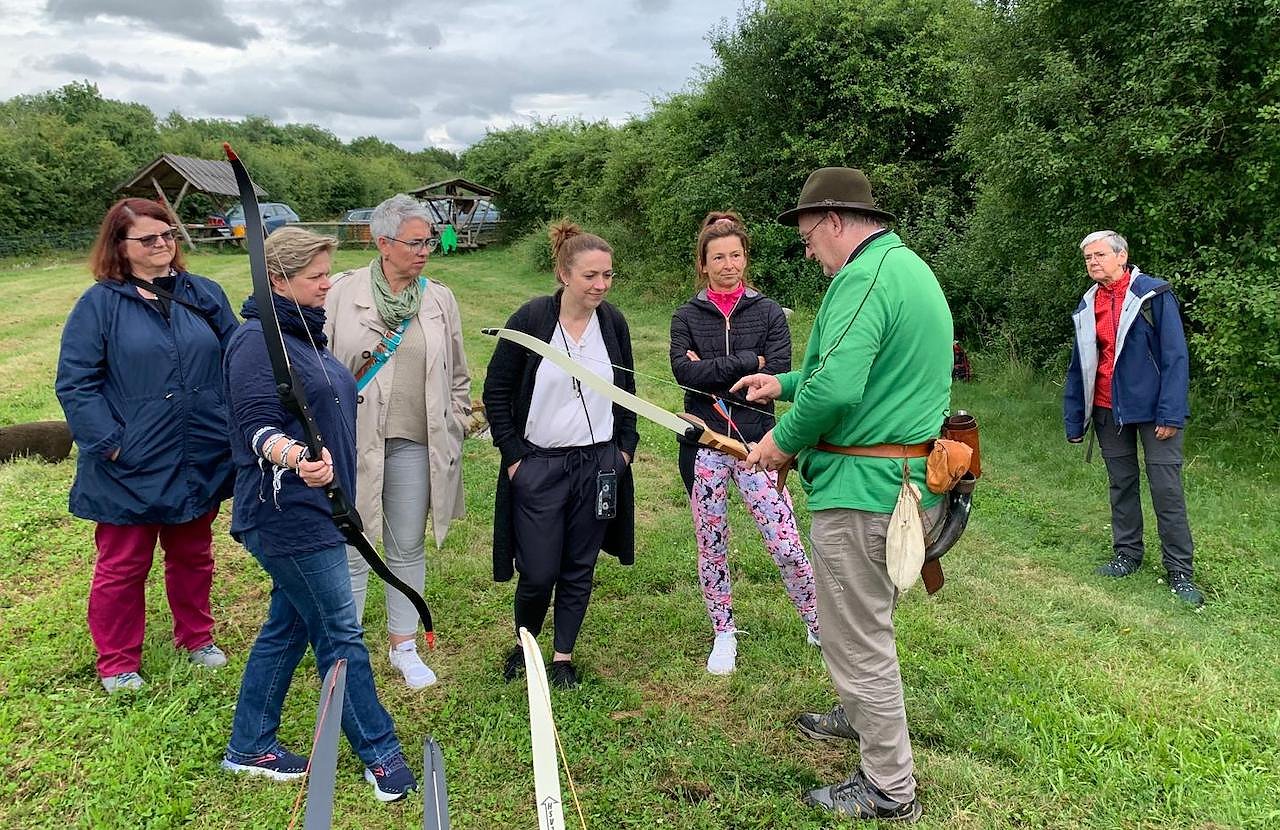 Besucht wurde der Schießplatz der Bogenschützen, welcher sich zwischen dem Flugplatz und dem Böhmenteich befindet. Fachmännisch von Bernhard Schäfer in die Kunst des Bogenschießens eingeführt, schossen die Gästeführer einige Pfeile auf Zielscheiben und künstliche Tiere. Der Bogensportpark ist ein 3D-Parcours, welcher durch unwegsames Gelände führt. Deshalb bahnten sich die Gästeführer den Weg durchs hohe Gras oder das Gestrüpp und fanden immer wieder interessante Stellen.