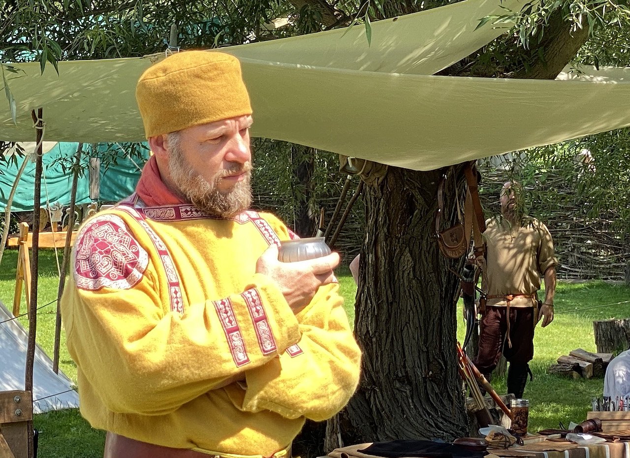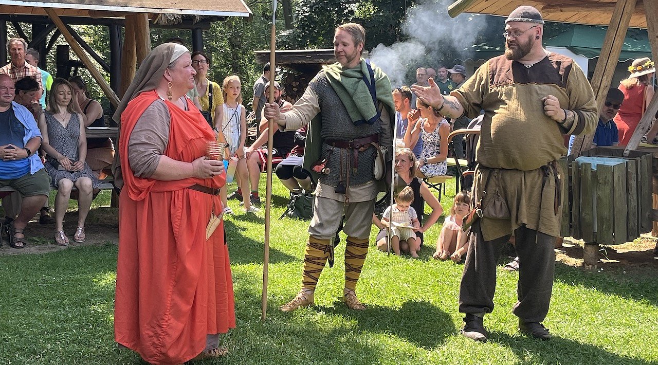 Von Modenschauen verschiedener germanischer Epochen bis zu Schaukämpfern der angriffslustigen Krieger, Beilwerfen, Weben, Spinnen und sachkundigen Erklärungen war alles dabei, was den Besuch der liebevoll gepflegten Anlage noch verschönern konnte.