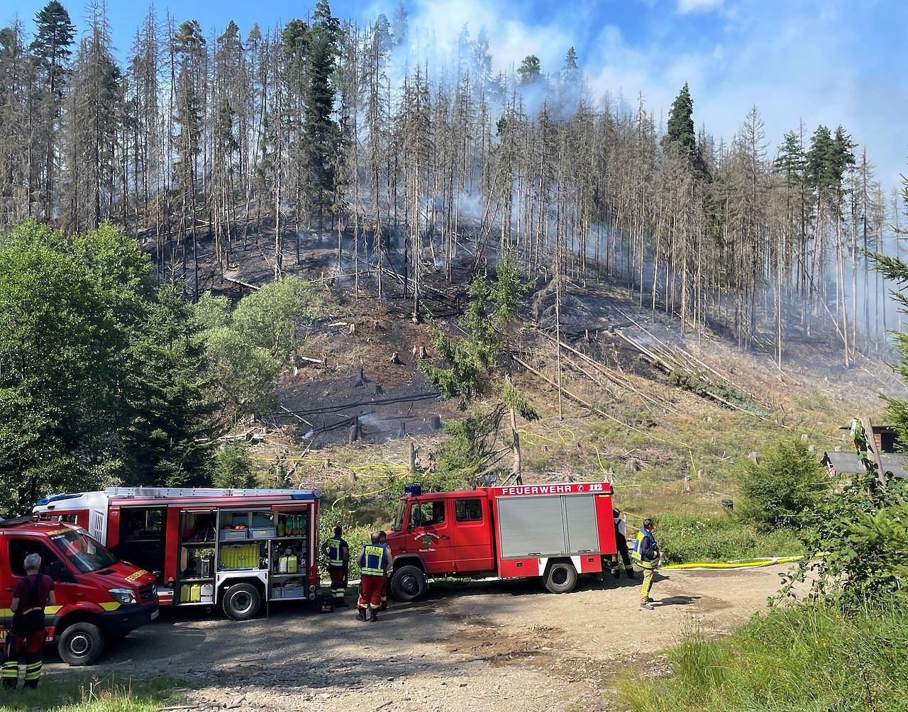 Waldbrände stellen für die Feuerwehren oft eine große Herausforderung dar: Steilhanglagen mit schlechter Begehbarkeit oder die schwierige Löschwasserbereitstellung, wie hier im Forstrevier Meura im Juli 2024, sind nur zwei davon (Foto: Niklas Singer)