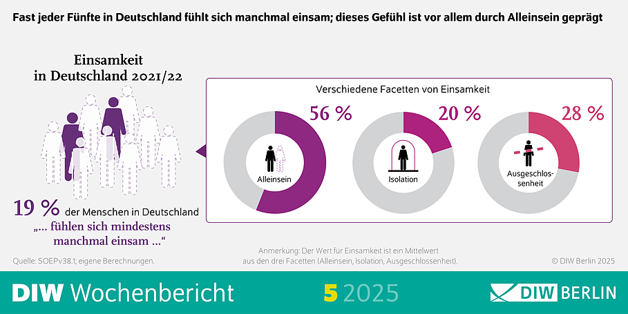 Die Untersuchung, basierend auf aktuellen Daten des SOEP, unterscheidet zwischen verschiedenen Facetten der Einsamkeit (Alleinsein, soziale Isolation und Ausgeschlossenheit) und errechnet daraus einen Einsamkeitsindex. Mehr als die Hälfte der in Deutschland lebenden Menschen gab an, sich manchmal oder häufiger allein zu fühlen (56 Prozent). Weniger verbreitet waren dagegen Gefühle von sozialer Isolation (20 Prozent) oder Ausgeschlossenheit (28 Prozent).