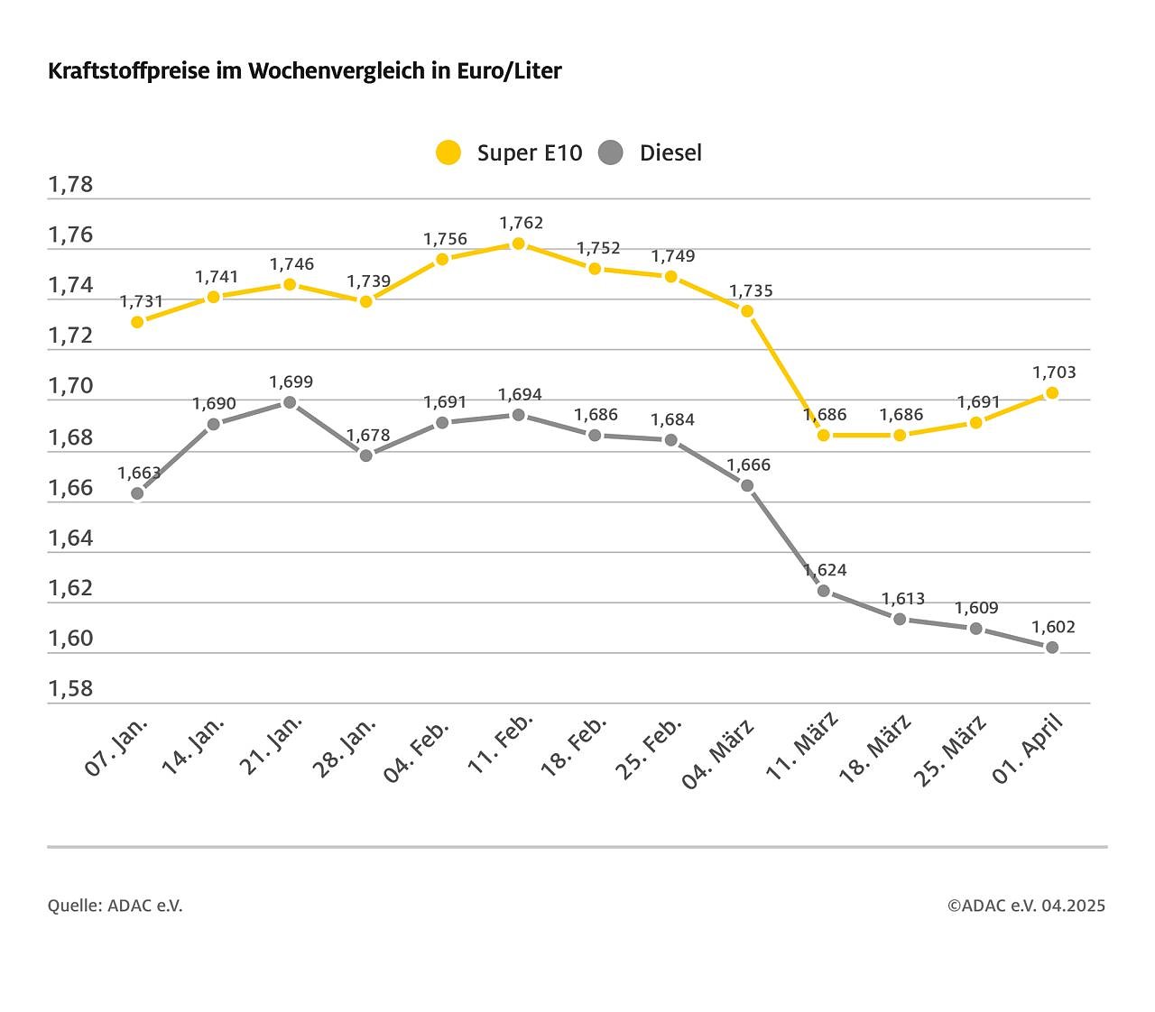 Der Rückgang des Dieselpreises dürfte insbesondere mit dem Ende der Heizperiode in Zusammenhang stehen. Sinkt die Nachfrage nach Heizöl, fallen nicht nur dessen Preise, sondern auch die für den produktähnlichen Dieselkraftstoff. Zu einer Preissenkung könnte zudem die seit Anfang April geltende Ausweitung der Ölfördermenge durch die OPEC+ führen. Dies dürfte sich jedoch nur dann positiv auf die Kraftstoffpreise auswirken, wenn nicht gleichzeitig andere Faktoren wie der Dauer-Krisenherd am Persischen Golf oder Strafzölle der US-Regierung den Ölpreis nach oben treiben. Aktuell kostet ein Barrel Rohöl der Sorte Brent wieder über 74 US-Dollar und damit gut einen Dollar mehr als in der Vorwoche.