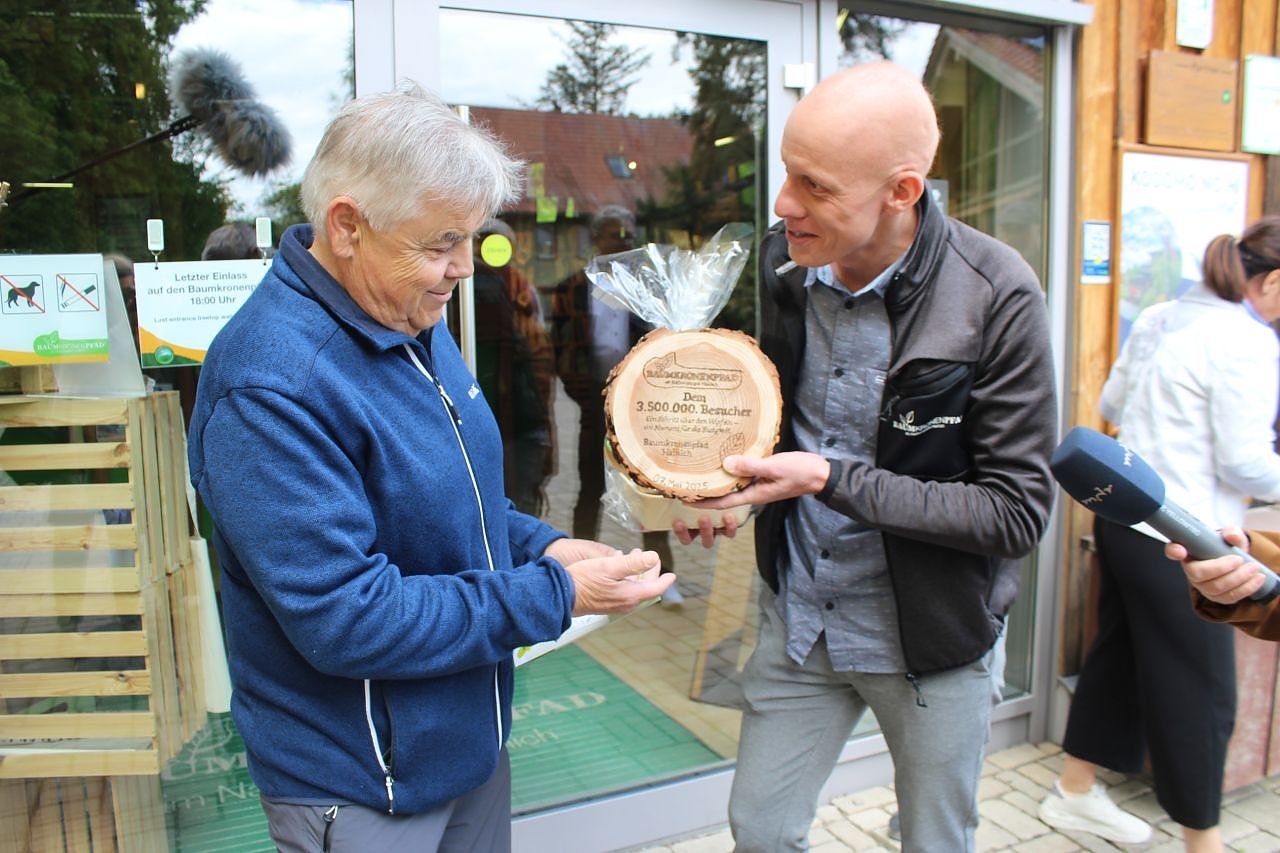Überraschung am Nachmittag: Der Betriebsleiter des Baumkronenpfades, Michael Zilling (re.), begrüßt den Dreieinhalbmillionsten Besucher (Foto: Eva Maria Wiegand)