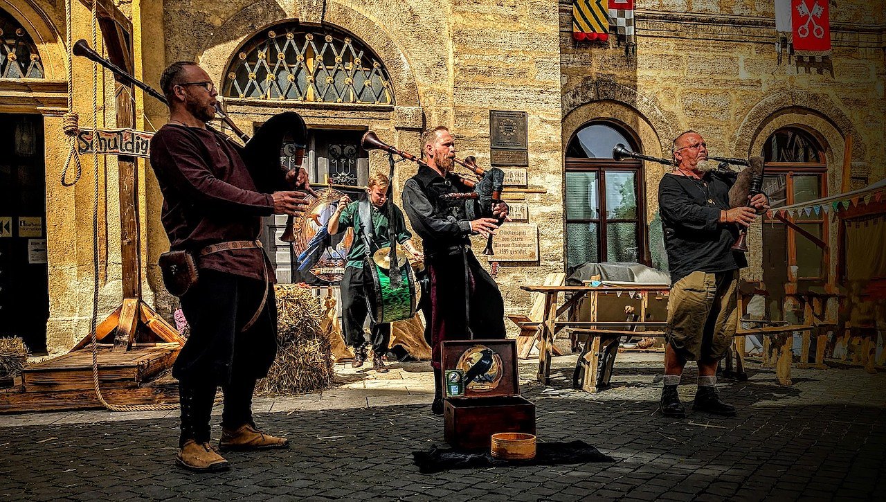 Elstertanz spielt bei einem früheren Mittelalterfest am Rathaus direkt vor dem freundlichen Henker auf (Foto: Thomas Puhl)