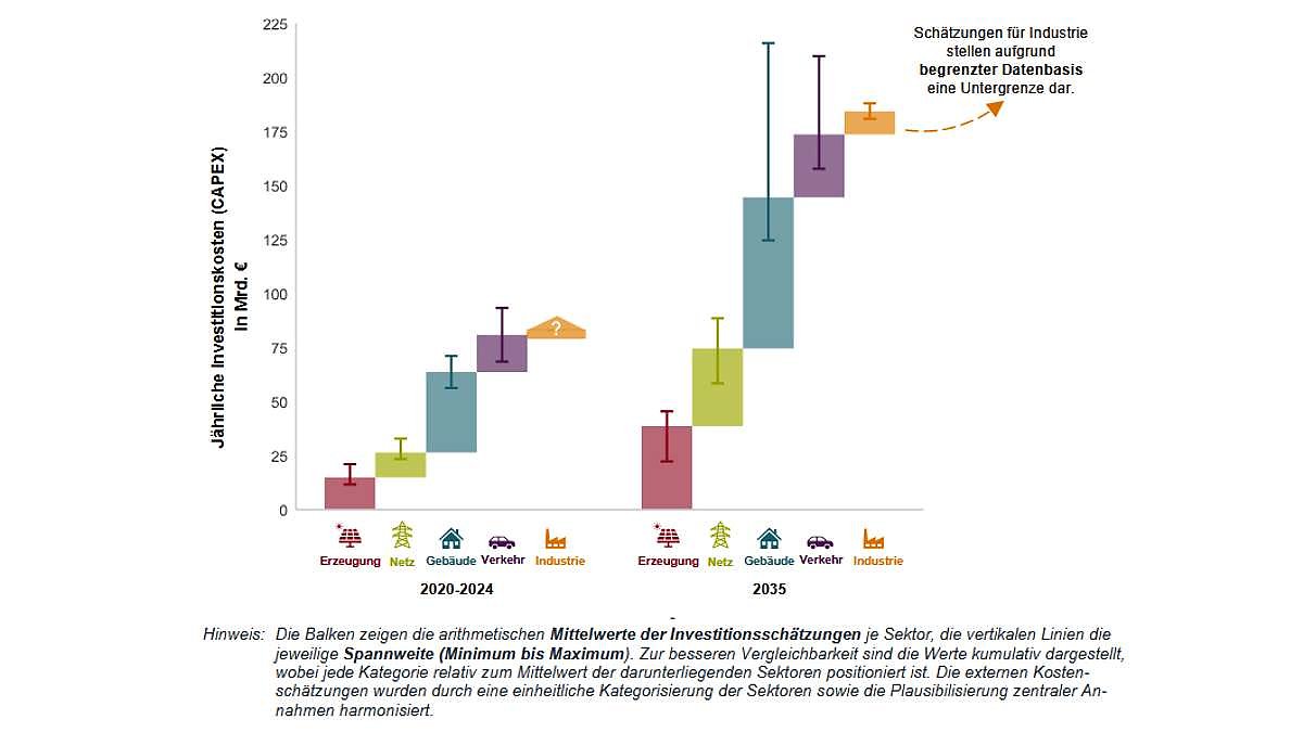 Bei Fortführung der aktuellen Energiepolitik müssten sich die jährlichen privaten Investitionen in den Sektoren Energie, Industrie, Gebäude und Verkehr mehr als verdoppeln – von rund 82 Milliarden Euro im Mittel der Jahre 2020 bis 2024 auf mindestens 113 bis 316 Milliarden Euro im Jahr 2035.
