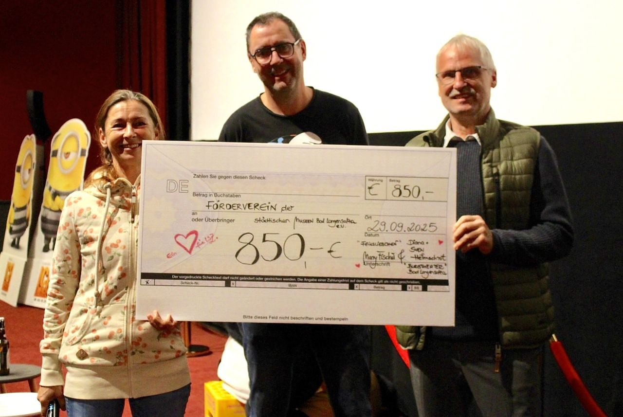 Über 4000 Besucher haben den Streifen inzwischen gesehen, die letzten knapp dreihundert spendeten mit ihrem Eintrittsgeld jeweils drei Euro für den Förderverein der Langensalzaer Museen, was zur erklecklichen Summe von 850 Euro führte, die am Abend im fast ausverkauften Kinosaal an den Vorstand des Vereins überreicht wurden. Zusätzlich begrüßte der Verein das 51. Mitglied im Förderverein. Peter Schulz, ein eingewanderter Langensalzaer, freut sich, jetzt aktiv werden und den Museen helfen zu können.