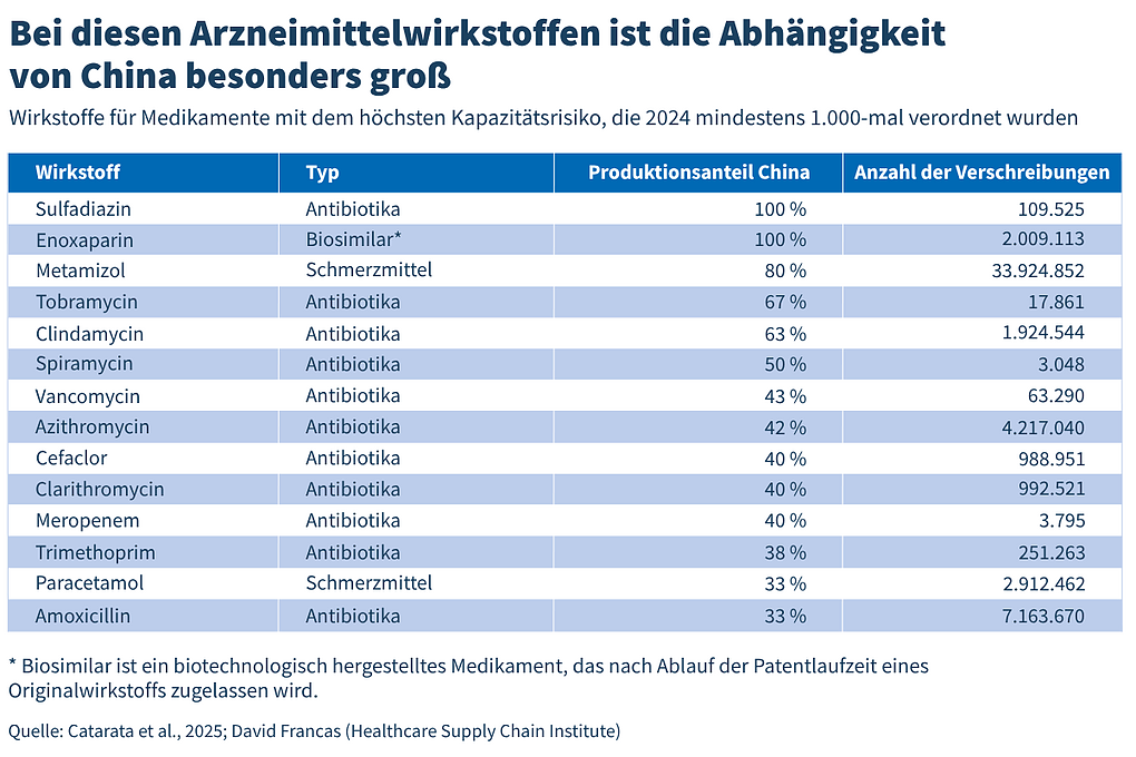 Bei 20 der 56 untersuchten versorgungsrelevanten Wirkstoffen besteht ein „hohes Kapazitätsrisiko“ – das heißt, mindestens ein Drittel der gesamten Produktionskapazitäten würde bei einem chinesischen Lieferstopp potenziell wegfallen. Käme es so weit, könnten hierzulande jährlich bis zu 42 Millionen Packungseinheiten wegfallen.