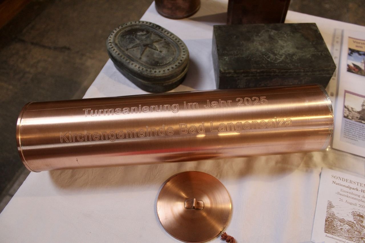 Den Buß- und Bettag hatte sich die evangelische Kirche Bad Langensalzas auserkoren, um in luftiger Höhe von über 70 Metern Zeitkapseln in den Turm der Marktkirche einzufügen, die kommenden Generationen von der heutigen Zeit künden sollen. Uns kündigt die Veranstaltung an, dass die aufwändige Restaurierung des Wahrzeichens der Kurstadt sich dem Ende nähert