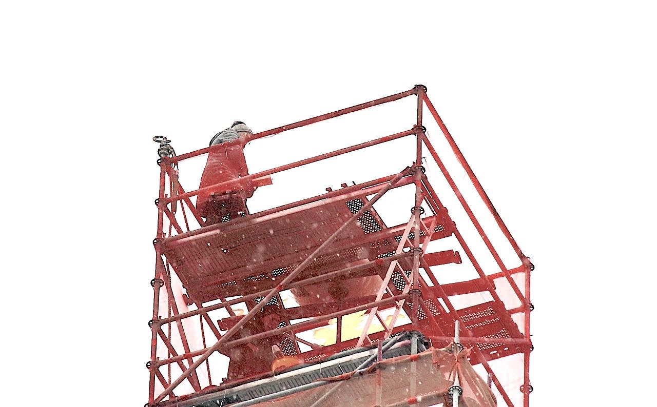 Dann ging es auch schon hinauf in himmlische Höhe, wo ein kalter Wind den Überbringern der Kapsel ins Gesicht blies und die ersten zarten Schneeflocken ihre Gesichter umtanzten. Die anschließende Aufsetzung der Turmbekrönung der Marktkirche mit einem goldenen Engel und einem Kreuz bildete den Abschluss der Zeremonie.