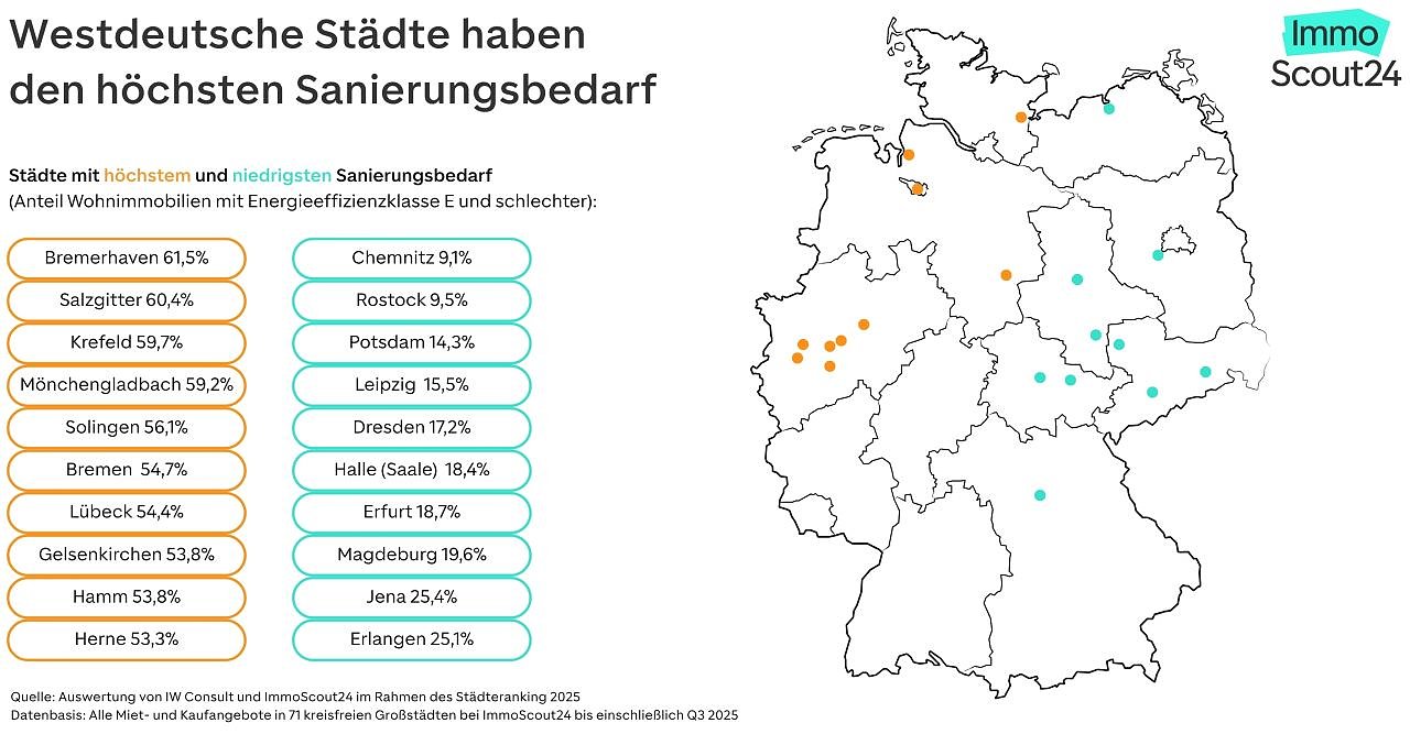 Viele Städte mit hohem Sanierungsbedarf liegen in Nordrhein-Westfalen und Niedersachsen. An der Spitze des Sanierungsbedarfs steht Bremerhaven mit 61,5 Prozent aller Immobilienangebote in den Energieeffizienzklassen E und schlechter. Knapp dahinter folgen Salzgitter mit 60,4 Prozent und Krefeld mit 59,7 Prozent.