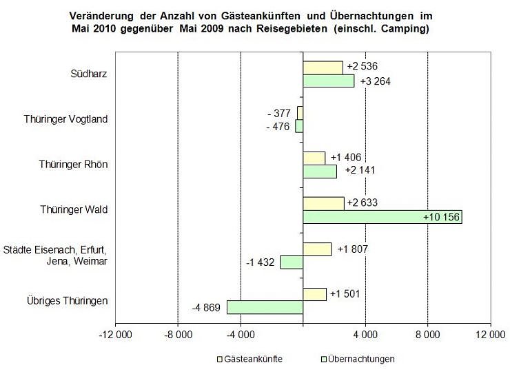Von Januar bis Mai 2010 buchten gut 1,2 Millionen Gäste fast 3,4 Millionen Übernachtungen in den Thüringer Beherbergungsbetrieben. Im Vergleich zum Vorjahreszeitraum war dies ein Gästezuwachs um 2,3 Prozent und ein Anstieg der Übernachtungen um 1,3 Prozent.