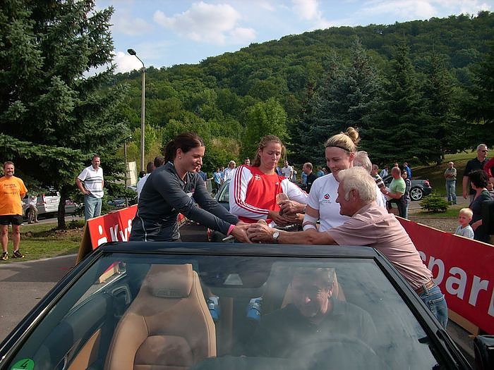Im ersten Wagen, die alle vom Autohaus Peter gestellt wurden, saß natürlich Speerwurf- Europameisterin Linda Stahl (im Bild links). Begleitet wurde sie von der Europameisterschafts-Vierten Katharina Molitor , sowie der Australierin Catherine Mitchel.