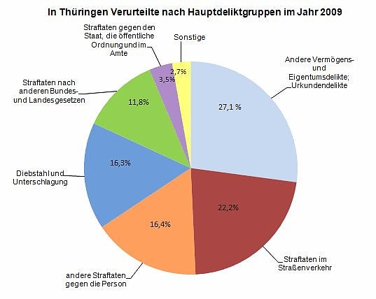 Die meisten Verurteilten (18 696 Personen) hatten gegen das Strafgesetzbuch und 3 605 Personen gegen andere Gesetze verstoßen.An der Spitze standen - wie im Jahr 2008 - die Straftaten gegen Eigentum und Vermögen. Dies waren Diebstahl und Unterschlagung (16 Prozent), Raub und Erpressung (1 Prozent) und die so genannten anderen Vermögens- und Eigentumsdelikte mit einem Anteil von 27 Prozent (hier insbesondere Betrug und das Erschleichen von Leistungen).