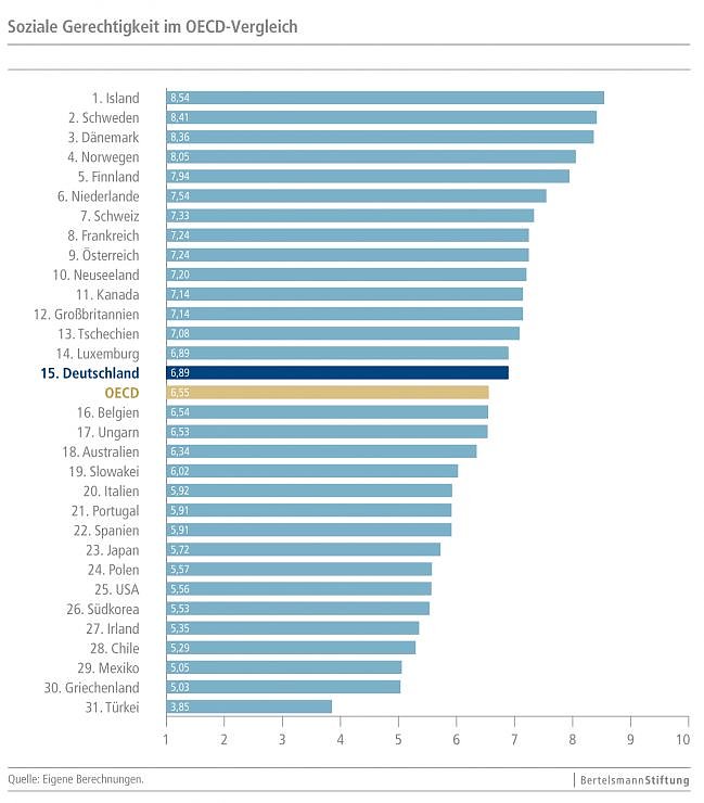 Unter die Lupe genommen wurden die Politikfelder Armutsvermeidung, Bildungszugang, Arbeitsmarkt, sozialer Zusammenhalt und Gleichheit sowie Generationengerechtigkeit. Angeführt wird der Gerechtigkeitsindex von den nordeuropäischen Staaten Island, Schweden, Dänemark, Norwegen und Finnland. Schlusslicht ist die Türkei.