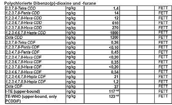 Autor: nnzDiese Häufigkeitsanalyse verschiedener Dioxin- und Furanverbindungen in der Probe, die foodwatch vorliegt, weist auf Rückstände einer Pentachlorphenol-Verbindung hin, wie sie als Fungizid eingesetzt wird. Andere mögliche Dioxin-Quellen wie etwa Erhitzungsvorgänge können demnach weitgehend ausgeschlossen werden. Die analysierte Futterfett-Probe war mit 123 Nanogramm Dioxin pro Kilogramm belastet - der gesetzliche Höchstwert von 0,75 ng/kg wurde damit um das 164-fache überschritten.