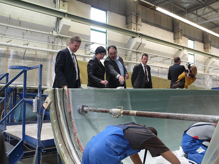Während einer kleinen Führung über das Werksgelände, konnte sich die angereiste Gruppe, zu der auch Mitglieder der CDU Landtagsfraktion gehörten, von den Dimensionen eines Rotors überzeugen. Ein Rotorblatt besitzt eine Spanne von 50,3 m, was für die gesamte Anlage eine Weite von 103 m und einen Ertrag von 2,5 MW bedeutet.