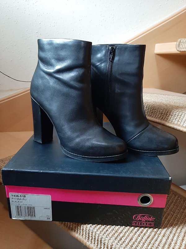 Verkaufe sehr wenig getragene schwarze Damen Stiefeletten von Buffalo, echtes Leder, innen Reißverschluß, 10 cm Absatz. Preis 20 €, Nichtraucherhaushalt, NDH. Erreichbar telefonisch oder Whats App.