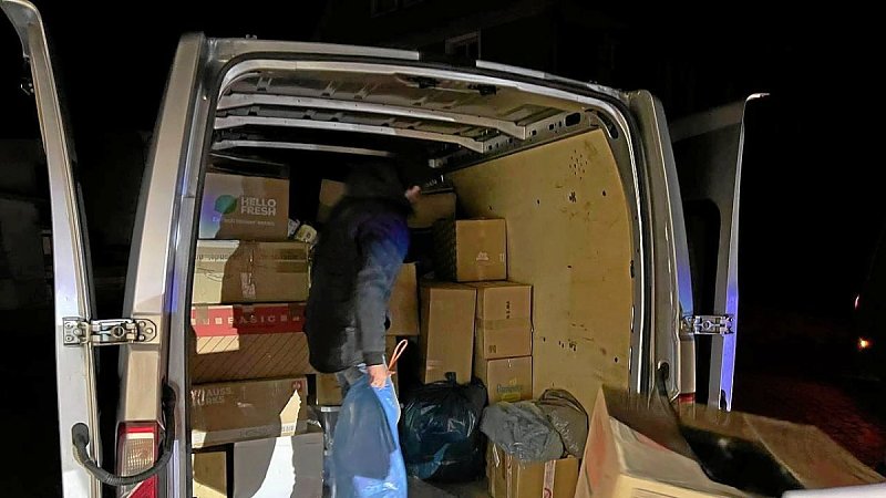 Fahrzeuge bringen Hilfsgütet auf den Weg zur rund 1.200 Kilometern entfernten polnisch-ukrainischen Grenze. Im Grenzgebiet würden die Hilfsgüter dann übergeben und werden weiter im Land verteilt.