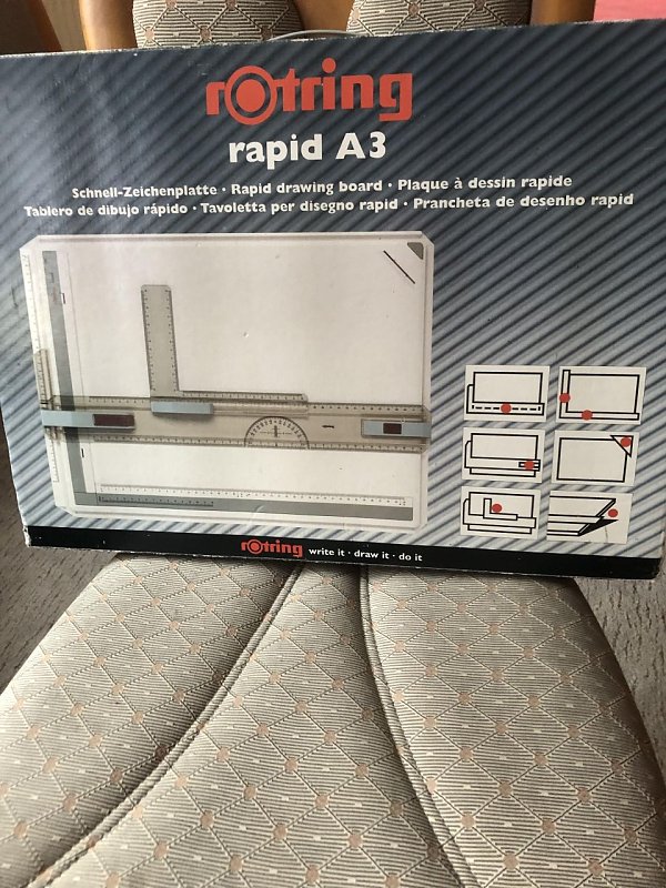 Verkaufe Schnell Zeichenplatte von Rotring rapid A3, wenig benutzt mit vielen verschiedenen Schablonen.Preis: 25,00 € (VB) plus Versand