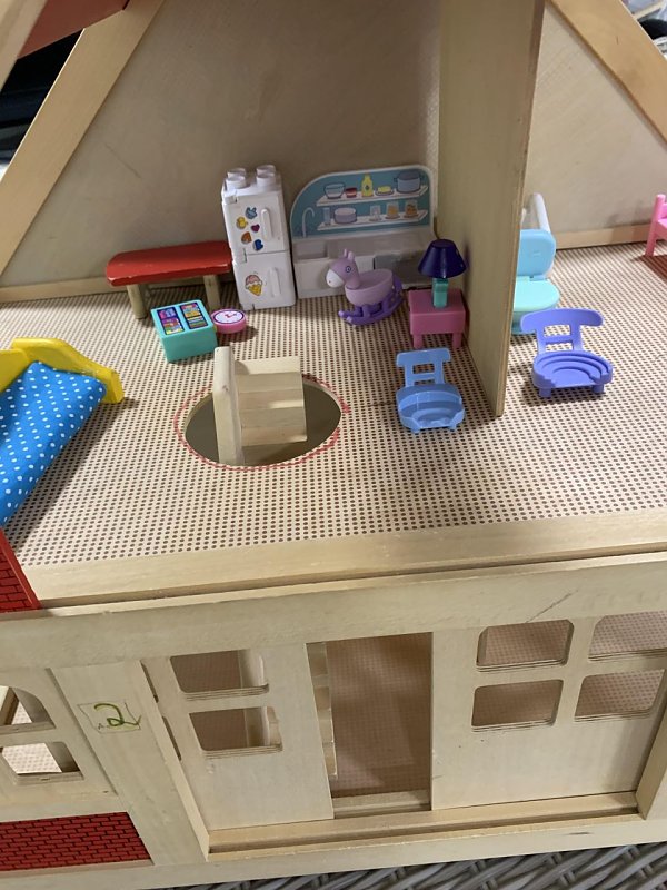Puppenstube Puppenhaus mit ETWAS Zubehör in Top-Zustand. Dieses liebevoll gestaltete Puppenhaus verfügt über 4 Zimmer - Schlafzimmer, Wohnzimmer, Küche und Badezimmer - auf 2 Stockwerken. Es ist kaum bzw. sehr wenig möbliert und eignet sich ideal für Kinder ab 2 Jahr. Das Set besteht aus Holz. Mit den Maßen H 58cm x B 63cm x T 36cm bietet dieses Puppenhaus stundenlangen Spielspaß für die Kleinen.