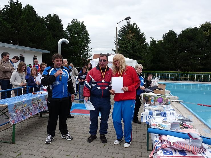 Barbara Kreutz (Foto oben bei der Siegerehrung) war mit geschwommenen 20 Kilometern der absolute Spitzenreiter aller Teilnehmerinnen und Teilnehmer. Nur Burkhardt Landgraf (ebenfalls Foto oben), der jedes Jahr extra von der Ostseeküste anreist, um bei diesem Schwimmfest dabei zu sein. Mit 900 Metern musste sich die 8-jährige Lena Bathke nicht verstecken, genau wie Maxim Zewe bei den 11-14-Jährigen, der es auf 8.000 Meter schaffte.