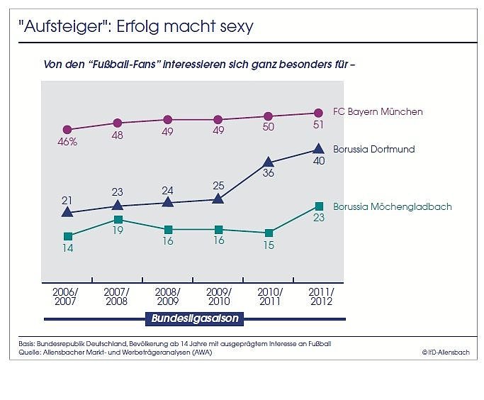 Am sichtbarsten ist dies bei Borussia Dortmund. Vor den beiden letzten, mit dem Gewinn der Meisterschaft gekrönten Bundesliga-Spielzeiten interessierten sich 25 Prozent der Fußballfans für Borussia Dortmund - parallel zum Gewinn der Meistertitel stieg das Interesse unter den Fans auf 40 Prozent. Bei Borussia Mönchengladbach ist das Interesse parallel zum Erfolg in der letzten Saison von 15 auf 23 Prozent gestiegen. Dauerhaft an der Spitze liegt der Rekordmeister FC Bayern München, für den sich - auch ohne Gewinn eines Titels - mit Abstand die meisten fußballbegeisterten Deutschen interessieren.