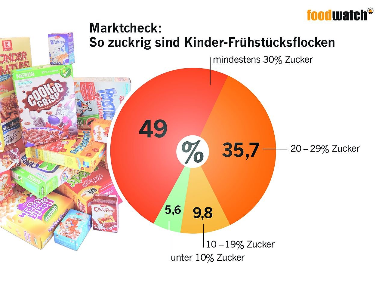 "Unser Marktcheck zeigt: Frühstücksflocken für Kinder sind in der Regel schlicht Süßigkeiten mit Müsli-Anstrich", sagt Oliver Huizinga von foodwatch. "Aus einem eigentlich ausgewogenen Produkt - Getreideflocken - hat die Industrie ein billiges Gemisch aus Mehlpampe und Zucker gemacht, mit dem Kinder schon am Frühstückstisch auf den süßen Geschmack geprägt werden." Die sogenannten ,Cerealien' für Kinder sind häufig sogar zuckriger als Kuchen oder Schokokekse. Für die Industrie sind die Flocken mit der billigen Zutat Zucker ein einträgliches Geschäft - für die Gesundheit der Kinder jedoch fatal. In Deutschland gelten bereits 15 Prozent der Kinder als zu dick, 6 Prozent sogar als fettleibig (adipös).