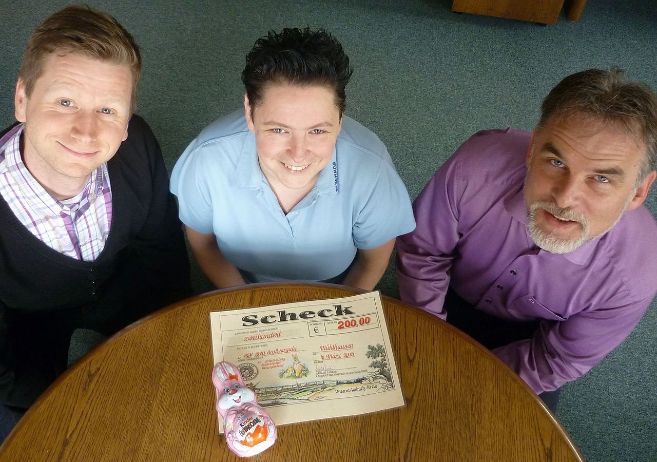 Er überreichte den entsprechenden Spendenscheck an den stellvertretenden Vorsitzenden des BSV 1920 Großvargula, Martin Lohrengel und dessen Kassenwärtin Rebecca Schuchardt.