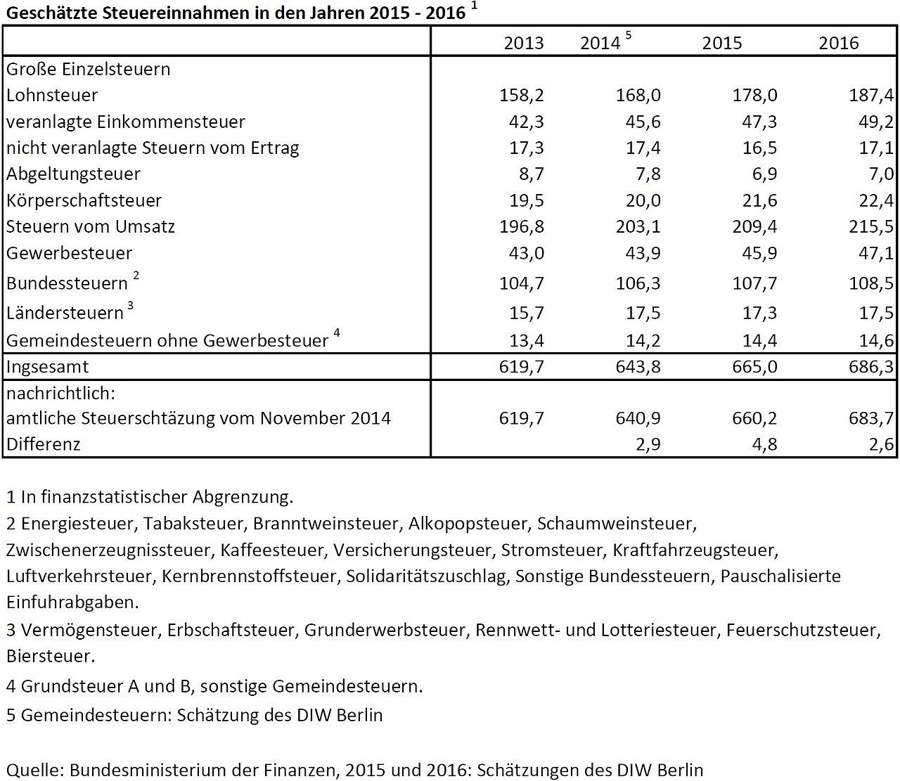 Die Steuereinnahmen werden nach Einschätzung des Deutschen Instituts für Wirtschaftsforschung (DIW Berlin) 2015 und 2016 höher ausfallen als in der amtlichen Steuerschätzung beziffert. Bund, Länder und Gemeinden können sich demnach im laufenden Jahr auf Mehreinnahmen in Höhe von zusammen fast fünf Milliarden Euro freuen...