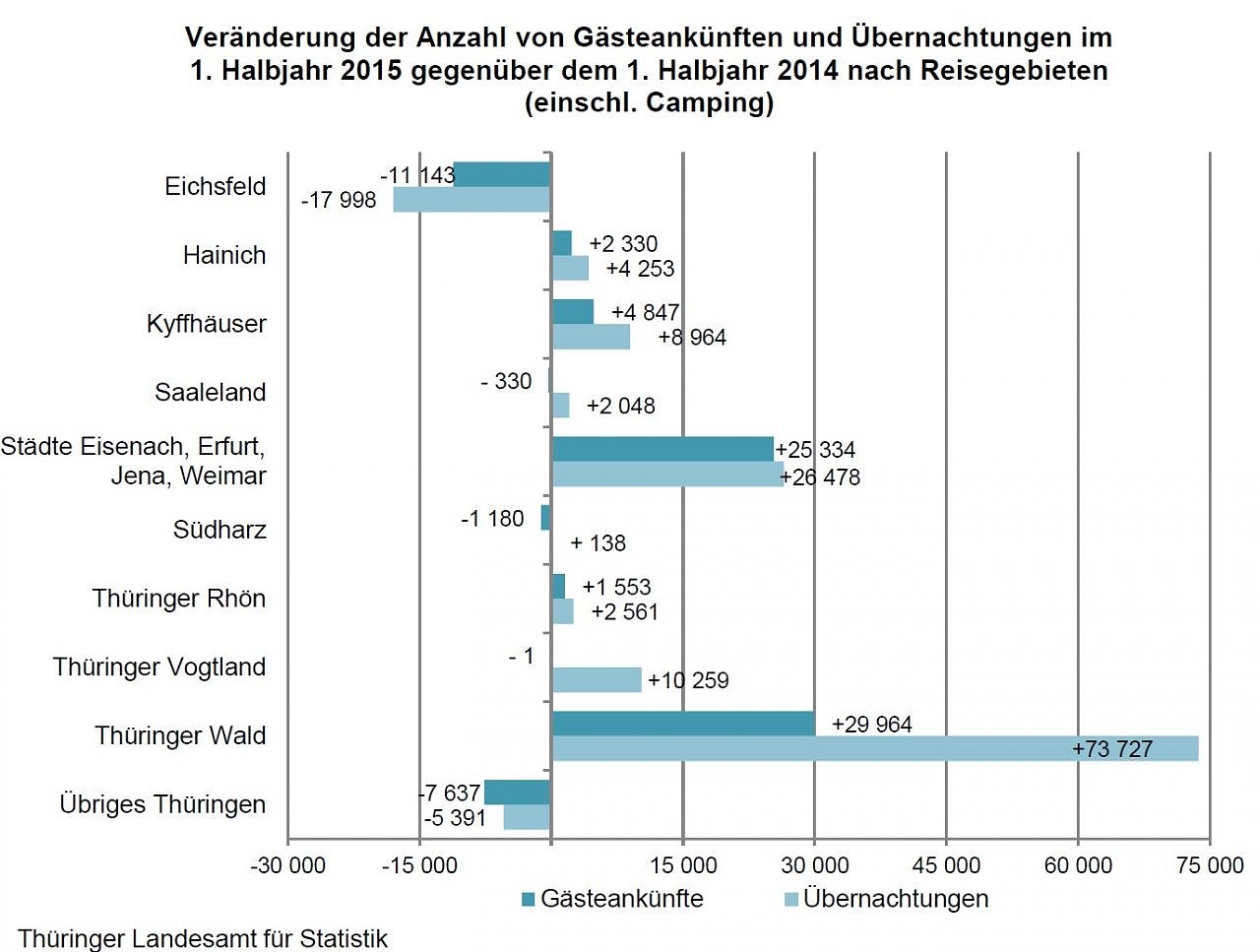 Im Gegensatz zu den genannten Reisegebieten musste das Eichsfeld und das Reisegebiet Übriges Thüringen, zu dem die Landkreise Sömmerda, Weimarer Land sowie der überwiegende Teil des Altenburger Landes gehören, im 1. Halbjahr 2015 einen Rückgang der Gästezahlen in Kauf nehmen, der insbesondere im Eichsfeld auch zu einem spürbaren Rückgang der Übernachtungszahlen führte (- 17 998 bzw. - 10,3 Prozent).