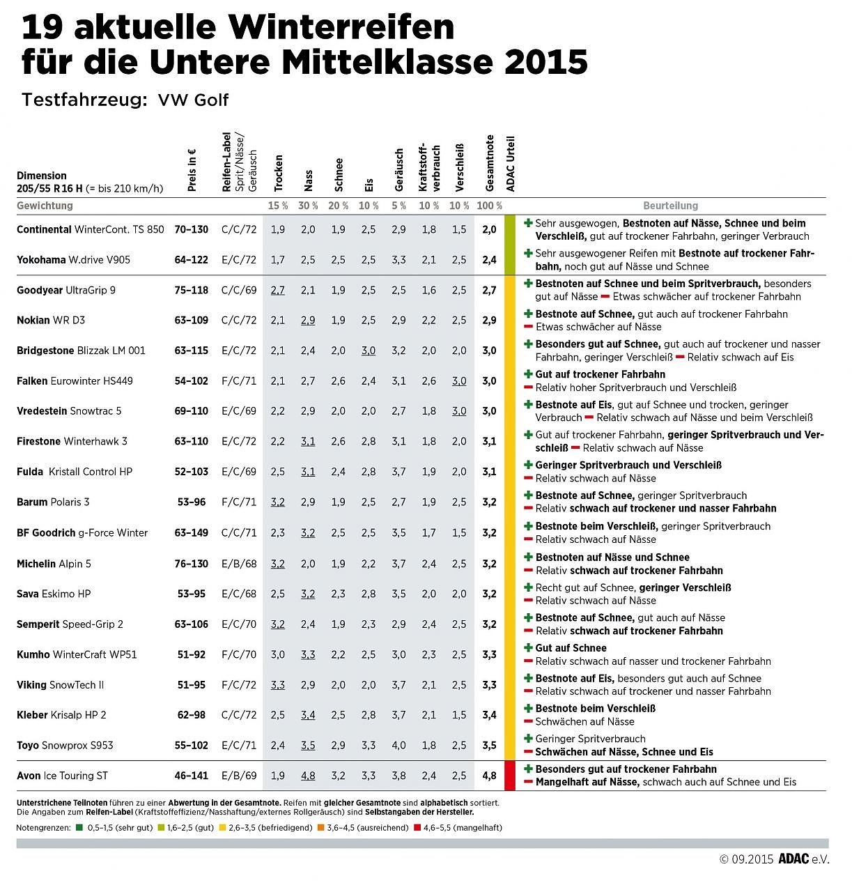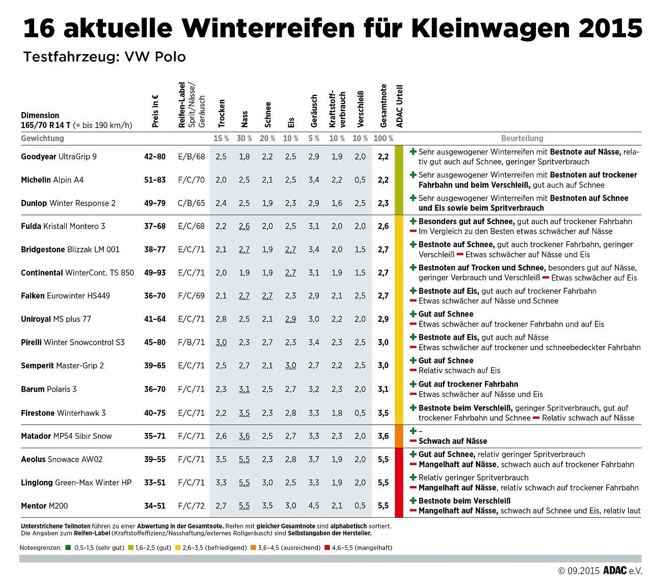 Für den ADAC-Winterreifentest 2015 hat der Club gemeinsam mit der Stiftung Warentest 35 Winterreifenmodelle in den Größen 205/55 R16H (untere Mittelklasse, zum Beispiel VW Golf) und 165/70 R14T (Kleinwagen, zum Beispiel VW Polo) unter die Lupe genommen. Der Reifentest berücksichtigt wichtige Sicherheitskriterien wie das Fahr- und Bremsverhalten auf nasser und trockener Fahrbahn, bei winterlichen Straßenverhältnissen und Aquaplaning sowie Eigenschaften wie Geräuschpegel, Kraftstoffverbrauch, Höchstgeschwindigkeit und Verschleiß.