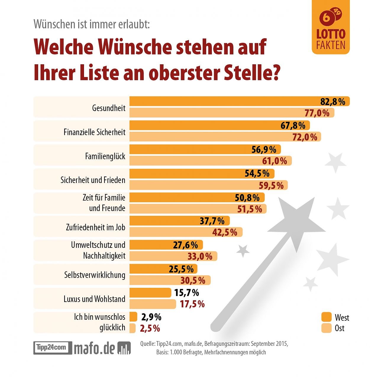 25 Jahre nach der Wiedervereinigung sind die Deutschen auch in ihren Wünschen vereint. Das ergab eine Umfrage von mafo.de im Auftrag des Online-Lotto-Anbieters Tipp24.com. Ganz oben steht in Ost und West die Gesundheit...